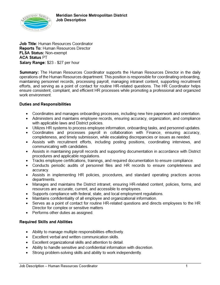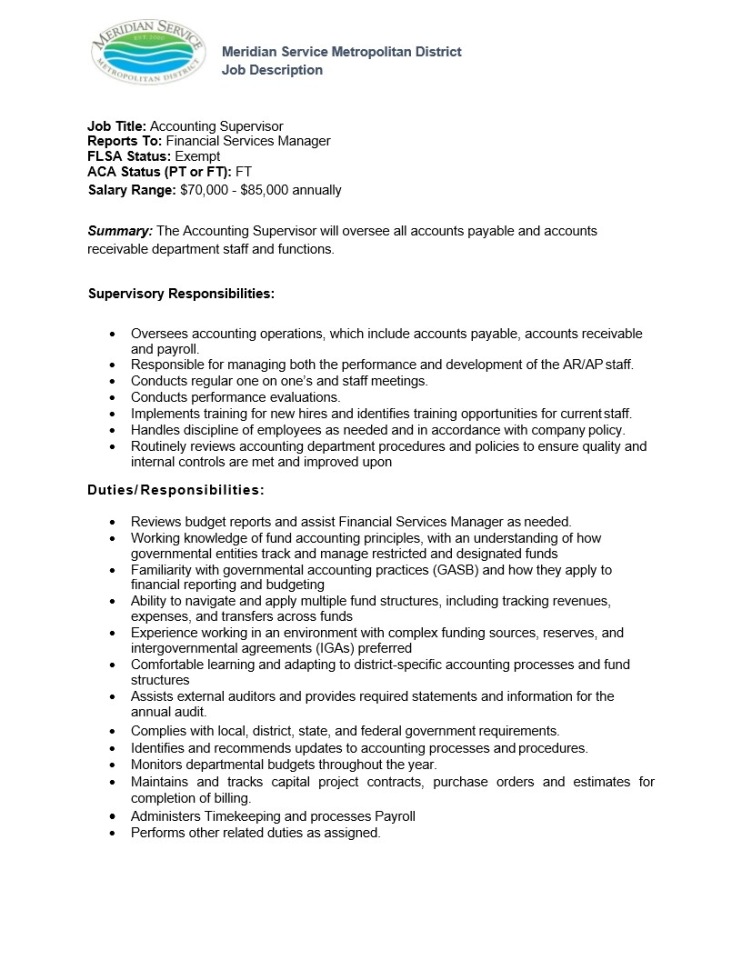 Water & Wastewater Operator Human Resources Coordinator Accounting Supervisor